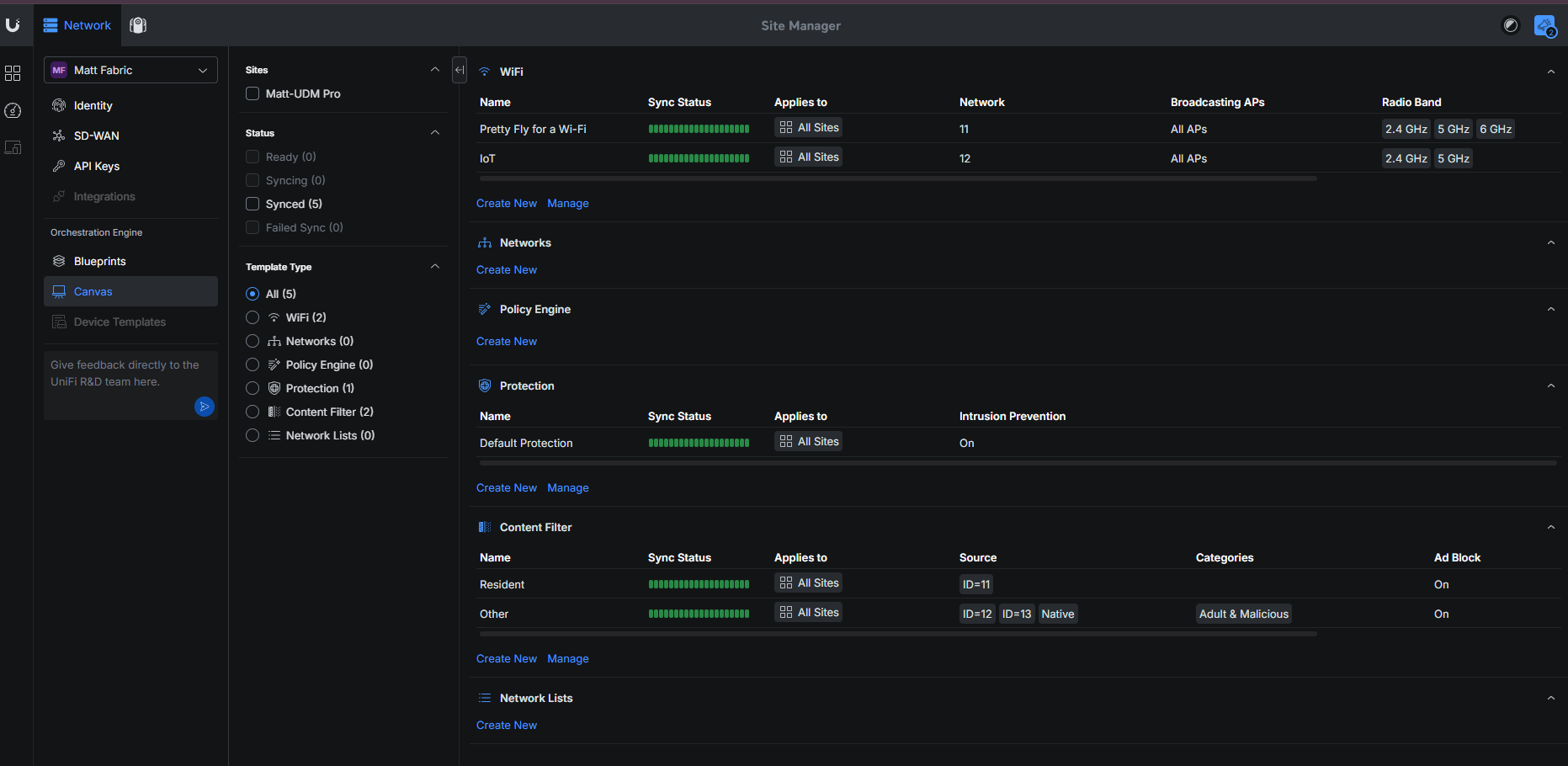 A Fabric is essentially a centralised control plane for managing multiple sites. Where this improves over Unifi’s traditional method is that we now have zero-touch deployment and policy enforcement options, thanks to the new Orchestration Engine, allowing us to configure a setting once and then apply it to all new and existing sites within the Fabric.