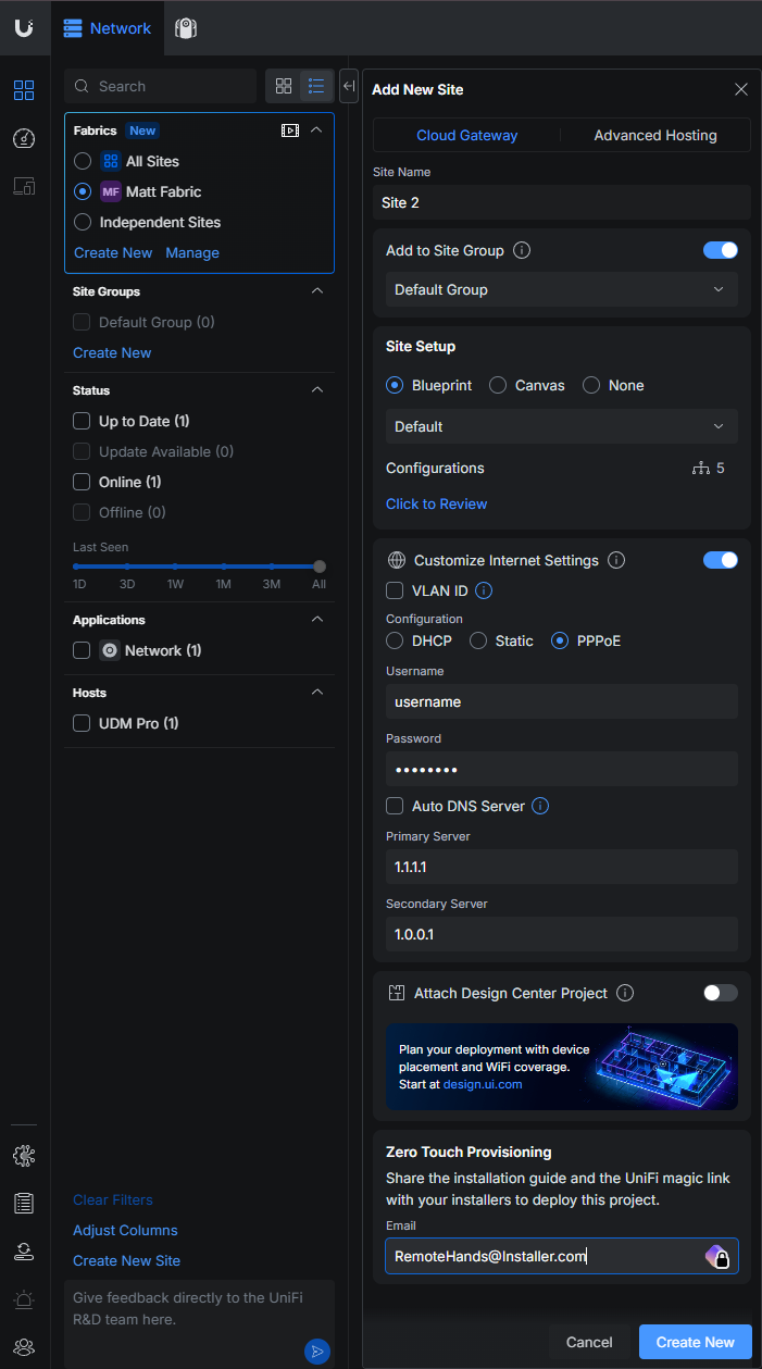 New sites can be pre-provisioned in the Fabric using the Blueprint, and installers can receive a Unifi Magic Link with instructions on how to quickly set up the new site with all Blueprint settings preconfigured and custom WAN settings per site.